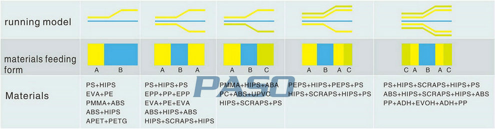 The co extrusion stretch film making machine uses LLDPE as main raw material with additional several kinds of resins to produce the single/double-side self-sticky stretch wrapping film. The finished stretch film has good tensile strength, anti-pricking ability and impact strength. Its good shrinking memory function and self-sticky can make goods integrity to prevent goods from loosening and collapsing during transportation and being polluted by dust.